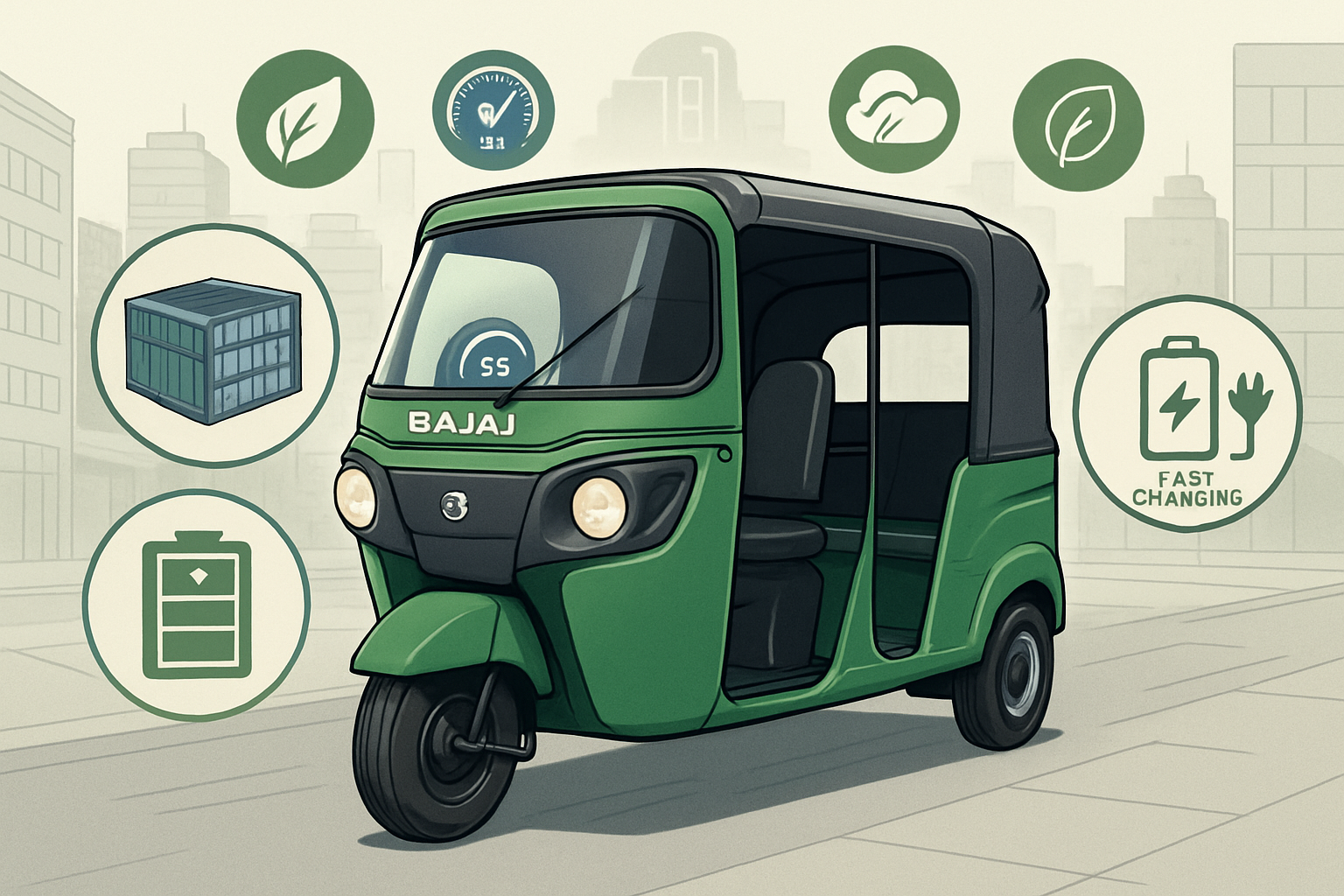 The Bajaj electric auto rickshaw is a battery-operated three-wheeler designed to provide smooth, emission-free rides. Unlike conventional petrol or CNG-powered autos, this vehicle runs entirely on electricity, making it an excellent choice for reducing pollution and lowering operating costs.